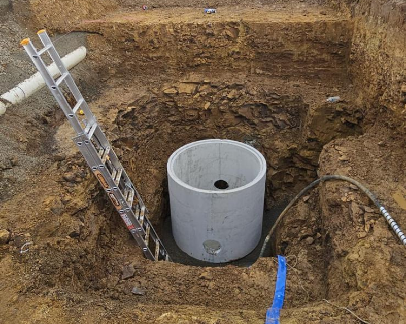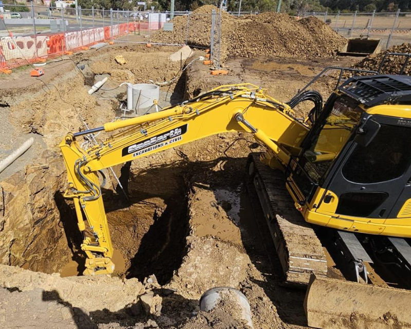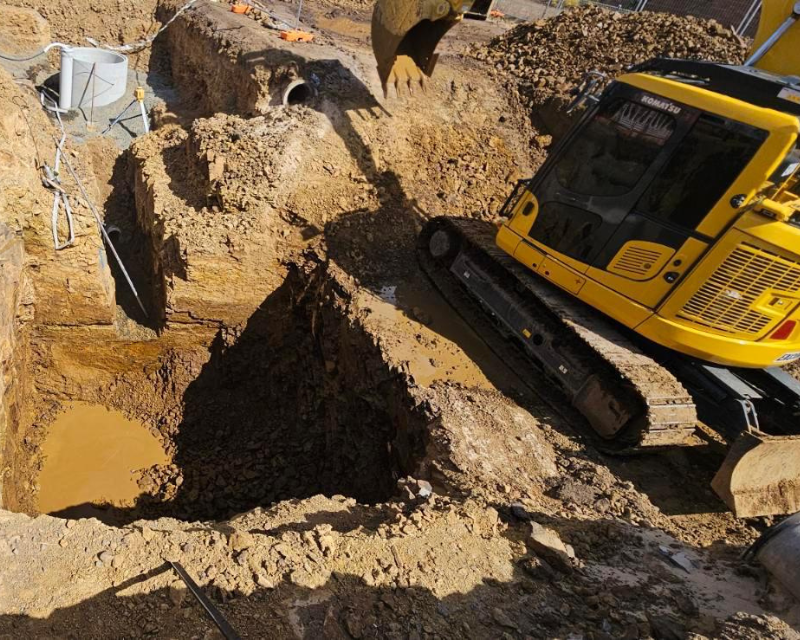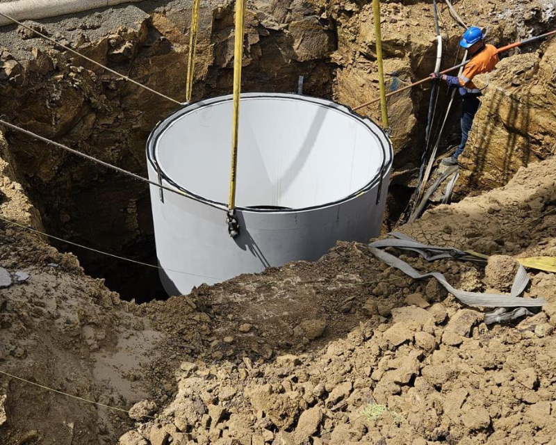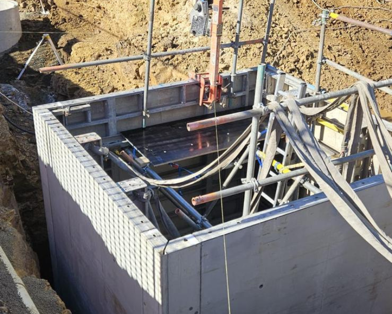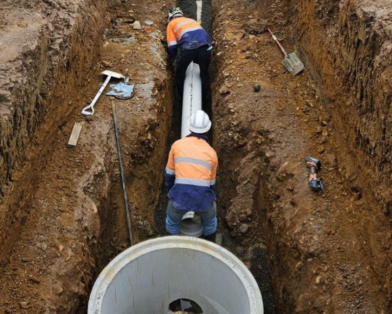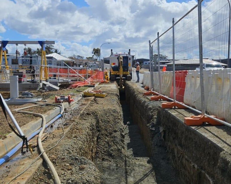 We had the privilege of contributing to works on the east coast of Tasmania providing a new pump station for Tas water. The works included excavating 8 metres deep beside an existing road and installing shoring boxes while providing safe access for the workers onsite. Install DN 2400 precast manhole pump station Excavate and lay gravity fed DN225 sewer pipeline, DN 180 HDPE rising main were also installed within our scope.
